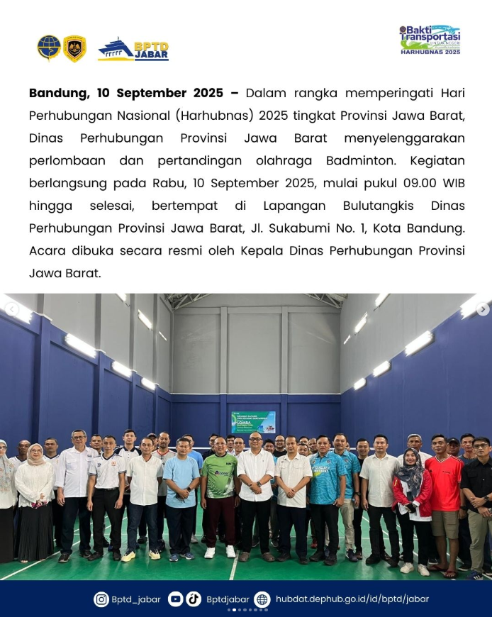 Dalam rangka Harhubnas 2025, Dinas Perhubungan Provinsi Jawa Barat menggelar perlombaan dan pertandingan Badminton di Lapangan Bulutangkis Dishub Jabar, Rabu (10/09). Kegiatan ini dibuka langsung oleh Kepala Dinas Perhubungan dan diikuti berbagai instansi terkait, termasuk BPTD Kelas I Jawa Barat, PT. KAI, Perum Damri, Jasa Raharja, dan Jasa Marga. Semangat sportifitas dan kebersamaan menjadi fokus utama dalam ajang ini!