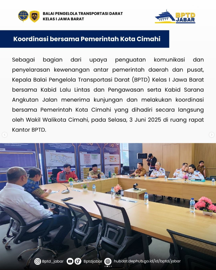 Sebagai bagian dari upaya penguatan komunikasi dan penyelarasan kewenangan antar pemerintah daerah dan pusat, Kepala Balai Pengelola Transportasi Darat (BPTD) Kelas I Jawa Barat bersama Kabid Lalu Lintas dan Pengawasan serta Kabid Sarana Angkutan Jalan menerima kunjungan dan melakukan koordinasi dengan perwakilan Pemerintah Kota Cimahi, pada Selasa, 3 Juni 2025 di ruang rapat Kantor BPTD yang dihadiri secara langsung oleh Wakil Walikota Cimahi.