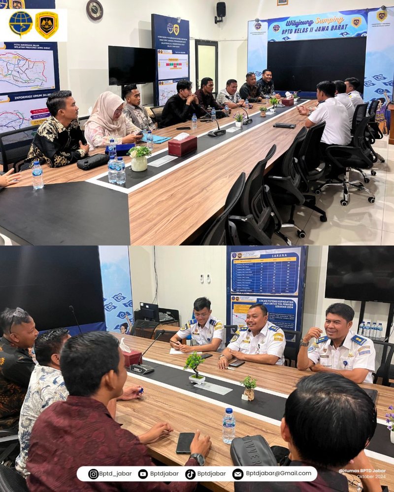 Kepala Seksi Lalu Lintas JSDPP Beserta Kepala Seksi Prasarana JSDP menerima kunjungan kerja terkait pembelajaran Koordinas Transportasi terkait pengawasan parkir oleh Bidang Pengawasan dan Operasional Lalu Lintas Perkotaan (Wasdalops Lalin Kota) Dinas Perhubungan Kota Palembang bertempat di Kantor BPTD Kelas II Jawa Barat.