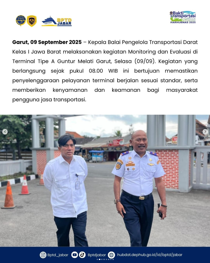 Garut, 09 September 2025 – Kepala Balai Pengelola Transportasi Darat Kelas I Jawa Barat melaksanakan kegiatan Monitoring dan Evaluasi di Terminal Tipe A Guntur Melati Garut, Selasa (09/09). Kegiatan yang berlangsung sejak pukul 08.00 WIB ini bertujuan memastikan penyelenggaraan pelayanan terminal berjalan sesuai standar, serta memberikan kenyamanan dan keamanan bagi masyarakat pengguna jasa transportasi.