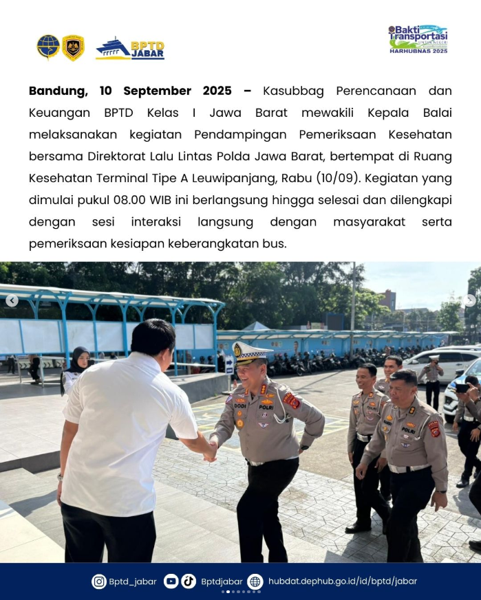 Acara turut dihadiri oleh Dirlantas Polda Jabar, Kombes Pol. Dodi Darjanto, serta didampingi oleh Kasubbag Perencanaan & Keuangan BPTD Jawa Barat, Bapak Danny Irawan S.